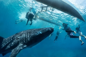 Я находился у южного побережья острова Себу, входящего в состав Филиппинского архипелага. Местечко называлось Ослоб и было знаменито на весь мир тем, что здесь на потребу публике устраивают кормление китовых акул, в компании которых любители острых ощущений могут всласть накупаться. С раннего утра десятки мелких лодчонок-катамаранов, доверху груженных густым "супом" из планктона, занимают прикормленные места у берега. А под водой уже кружат в ожидании завтрака исполинские рыбины. Как только катамараны останавливаются, китовые - самые проворные из них - зависают вертикально у самого борта с разинутой пастью, куда хозяева лодчонок ведрами вливают планктоновый суп. А те, кто не успел к раздаче, кружат под водой рядом в ожидании своей очереди.