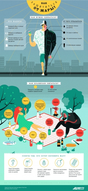 3. При выходе на улицу рекомендуется надевать легкую одежду из натуральных тканей светлой расцветки, желательно, чтобы ворот одежды был не тугим, на улице обязательно пользоваться головным убором (летняя шляпа, панама, платок и т.п.), солнцезащитными очками, зонтиками.
