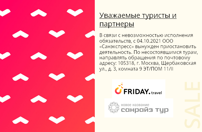 «Уважаемые туристы и партнеры! В связи с невозможностью исполнения обязательств с 04.10.2021 ООО «Санэкспресс» вынуждено приостановить деятельность. По несостоявшимся турам направлять обращения по почтовому адресу: 105318, г. Москва, Щербаковская ул., д. 3, комната 9 ЭТ/ПОМ 11/II».