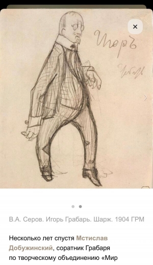 Как и реальную выставку, виртуальный гид открывает портрет Игоря Грабаря, выполненный его сокурсником по Академии художеств, художником Филиппом Малявиным. С этой работы начинается знакомство с мастером, его семьей и тем путем, который привел будущего художника в Петербург, в Академию художеств. Пользователи приложения «Артефакт» узнают историю создания Ф.А.Малявиным портрета художника, увидят дружеский шарж на Игоря Грабаря – карандашный рисунок Валентина Серова, и портрет художника кисти Бориса Кустодиева, написанный в период работы над групповым портретом объединения «Мир искусства».