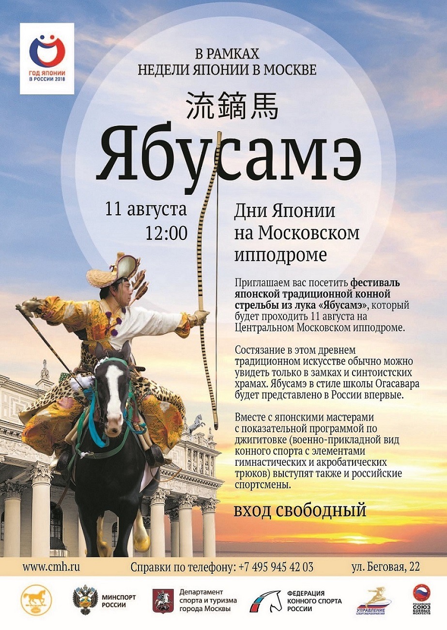 11 августа на Московском ипподроме в рамках «Недели Японии в Москве» состоится демонстрация японского традиционного искусства стрельбы из лука на скаку – Ябусамэ. Посольство Японии в России в сотрудничестве с Министерством спорта Российской Федерации и Федерацией конного спорта России проведет показательные выступления по Ябусамэ в исполнении представителей японской школы «Огасавара-рю». Японские лучники будут выступать в полном традиционном облачении. В нашей стране это боевое искусство будет продемонстрировано впервые. После выступления японских мастеров будут также выступать российские мастера джигитовки. Начало в 12:00, Московский ипподром (ул. Беговая, 22), вход свободный.